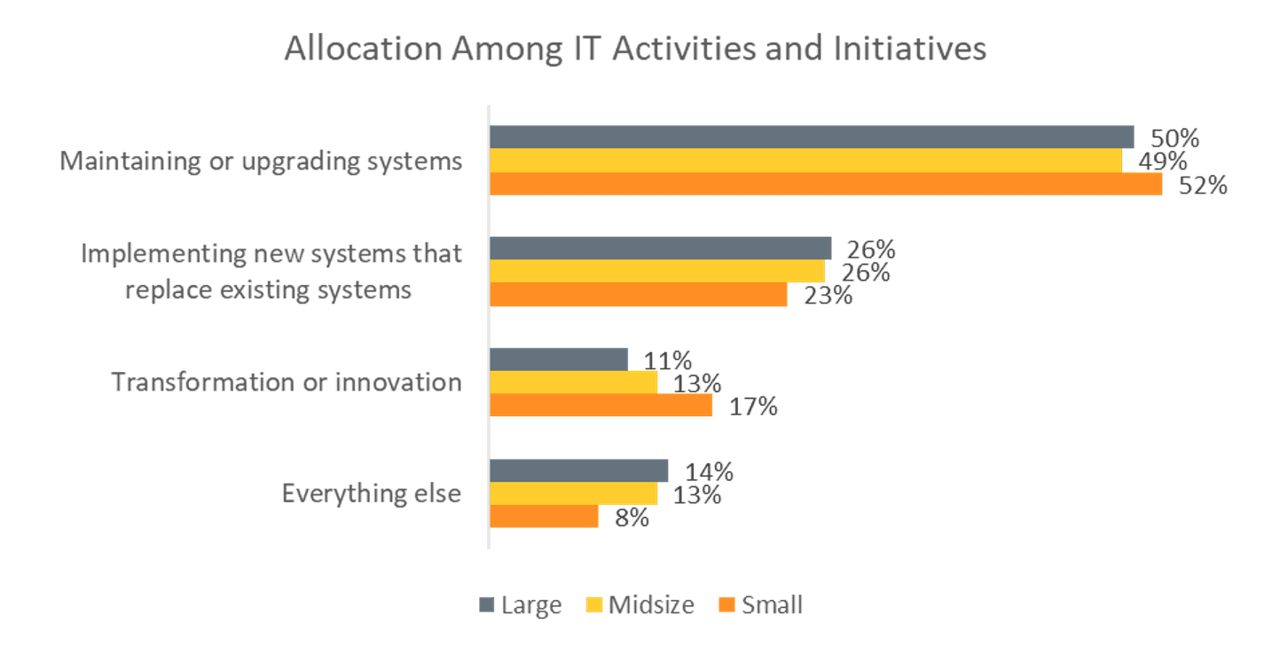 以下のグラフは、大手、中堅、中小の保険会社CIOが、ITリソースのかなりの部分を新しいシステム、トランスフォーメーション、イノベーションに割り当てていることを示している。