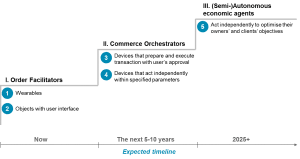 Wearables and objects with user interface (e.g. a fridge with a screen or an Amazon Dash button) allow customers to place orders and pay in ways other than a plastic card or a computer screen. But the customers are still in control - they decide what they want to buy, find the goods and services that are right for them, and initiate a purchase transaction. Going forward, we expect connected devices to play an active role in orchestrating a commerce transaction — realising that the user needs something, suggesting where and how those needs can be fulfilled, preparing a transaction, and potentially executing it. Think of a car keeping a parking meter topped up until you finish your meeting. Ultimately, we will see the emergence of semi-autonomous economic agents capable of acting independently, including making and accepting payments, to optimise their own, their owners’, and their clients’ objectives. Think of a self driving car paying other cars to get out of the way if it's passenger is in a hurry.