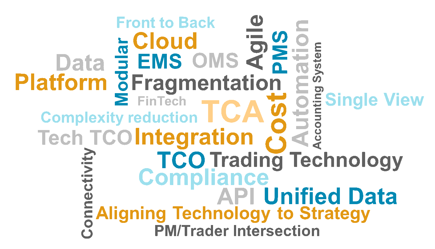 以下のワードクラウドは、バイサイドのトレーディングシステムをめぐる意思決定者にとっての最優先課題を示している。