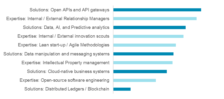 It should come as no surprise that the two top two capabilities being pursued by innovation leads across the industry are: (1) developing environments to make better use of open-APIs; and (2) hiring the right people and cultivating skills to ensure new partnerships can be formed in a way that works for all.