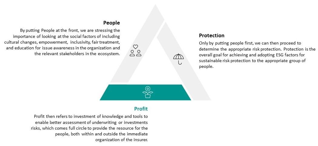 ESGと保険に関して、人、補償、利益に焦点を当てて整理したコンセプトを以下に図解する。これは、三つの重要な要素である利益、人、地球の保険の視点から見たビジネスコンセプトである。